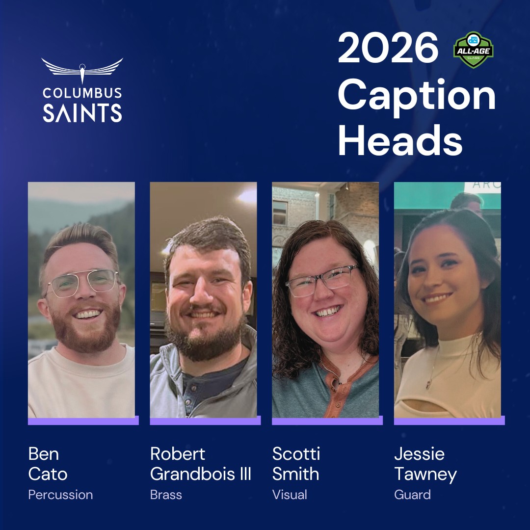 The Columbus Saints Drum & Bugle Corps is excited to officially announce its dynamic and highly-qualified Caption Head team for the upcoming 2026 Drum Corps International (DCI) All-Age season. This leadership group features a blend of accomplished veterans and a decorated new face, all poised to lead the Saints to new heights.